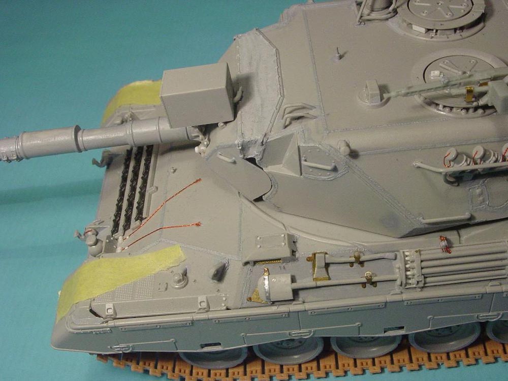I used Voyager's Leo 2A5 PE set. The box for the refuelling funnel (the white thing in the middle) was scratched because Hobby Boss simply forgot it. The gun travel lock is a resin copy of the Tamiya part.