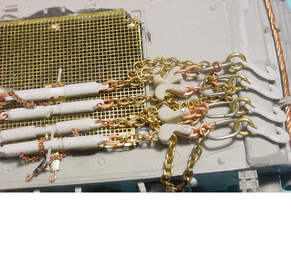 The slats are result of about 8 hours soldering Eduard's slat armour PE. Before gluing them to the tank, I cut off the lower part to get the short slat segments used with the mine-roller version.