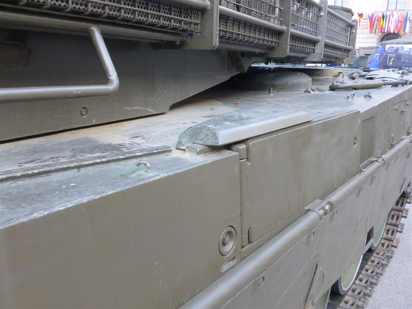 This Leopard 2A4 is fitted with a pair of stowage baskets down each side of the turret. The turret basket was introduced in 2012 as an upgrade programme for Austrian 2A4s. Some tanks from Panzerbataillon 14 were fitted with this basket, but this upgrade was stopped due to budget saving plans before it could reach all tanks.