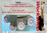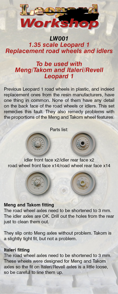 Previous Leopard 1 road wheels in plastic, and indeed replacement ones from the resin manufacturers, have one thing in common. None of them have any detail on the back face of the road wheels or idlers. This set remedies this fault. They also remedy problems with the proportions of the Meng and Takom wheel features.